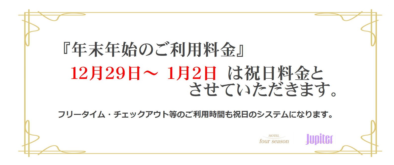 ホテル・フォーシーズンのホームページをご覧頂き誠にありがとうございます。 当ホテルは、お二人の大切なお時間を心地よく、贅沢な気分で過ごして頂きたいと考えております。